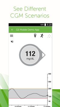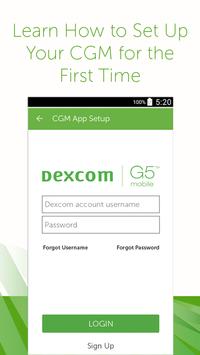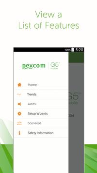The simulator displays samples of CGM scenarios, trends and various setup features associated with the Dexcom G5 Mobile CGM App.