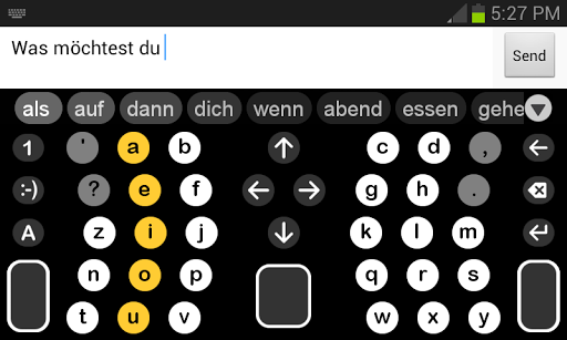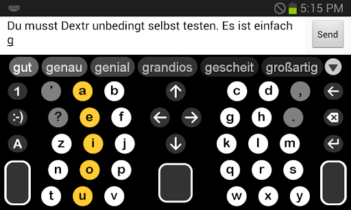 Es macht einfach Sinn. Selbst Handy-Neulinge finden sich auf Dextr's revolutionärem "Smart ABC" Keyboard ruckzuck zurecht. Es ist und bleibt die schnellste und einfachste Möglichkeit, um Nachrichten zu verschicken. Mit Dextr sind neue Schreibgeschwindigkeitsrekorde vorprogrammiert!