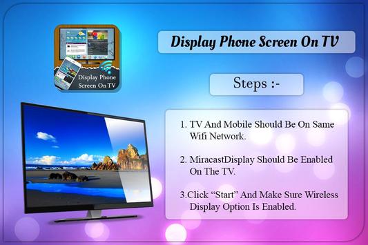 Display Phone Screen On TV App will assist you to scan and mirror your android phone or tab's screen on smart TV/Display (mira cast enabled ) or Wireless dongles or adapters.