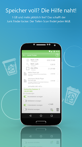 Installierte Apps, heruntergeladene Dateien, Bilder, Musik, Videos - auch auf Ihrem Handy sammelt sich im Laufe der Zeit ein unüberschaubarer Datenwust an, der das System spürbar ausbremst. Mit Ashampoo Droid Optimizer befreien Sie Ihr Smartphone von unnötigem Ballast und holen sich freien Speicherplatz und Leistung zurück - regelmäßig und vollautomatisch. Und wenn ein Ordner immer neu gelöscht werden soll, fügen Sie ihn einfach bei bei 1-Touch Speed Up und Auto Clean Up hinzu. Das geht auch direkt im Junk-Finder!