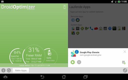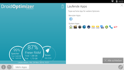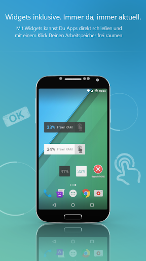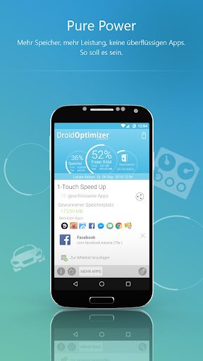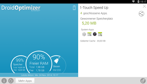 Was gerne verschwiegen wird: So einfach geht das nicht! Nur mit Root-Rechten kann man die CPU herunter takten, sie wird dann kühler, leistet aber auch weniger. Möglich ist hingegen, überflüssige Apps abzuschalten und so maximal Arbeitsspeicher und Rechenpower freizugeben - und das erledigen Auto-Aufräumen und das 1-Touch Speed Up Widget extrem gut. Sie merken schon, der Droid Optimizer braucht keine großen Worte, sondern lässt Taten sprechen!