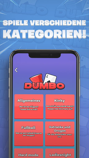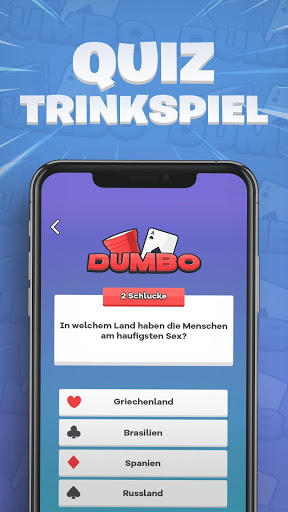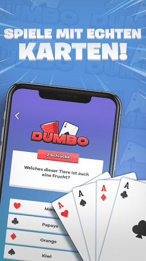 Dumbo ist ein kostenloses Party-Trinkspiel, das Sie komplett offline spielen können. Unterstützt mindestens zwei Spieler, kann aber mit großen Gruppen gespielt werden.