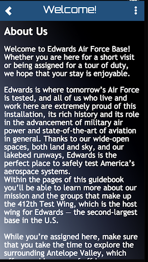 Willkommen auf der offiziellen App von Edwards Air Force Base, dem Zentrum des Aerospace-Tests-Universums!Wir hoffen, dass Sie diese App verwenden werden, um mehr über unsere Mission zu erfahren und zu leben und an Edwards zu arbeiten.Zusätzlich ist diese App Ihr One-Stop-Standort für Nachrichten, Updates und Informationen zu Edwards!