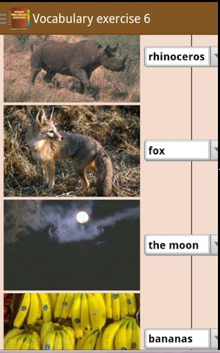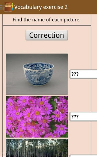 English vocabulary exercises is an application for smartphone and Android tablet. It contains 44 exercises and 264 images to learn English and improve your vocabulary with interactive and relevant exercises. Just install this application on your Android smartphone or tablet and start exercising to grow in English. English vocabulary exercises is easy to use for small children and is very fun. It requires internet connection at the first use to recharge the images.