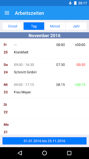 • Einsehen der Arbeitszeiten, Urlaubs-, Krankheits- und Feiertage in der Kalenderansicht