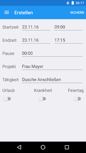 • Manuelle Eingabe von Startzeit, Endzeit und Pause von Arbeitszeiten