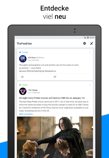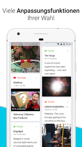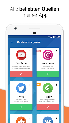 Einzelne Liste für alle News-Feeds von Ihren Konten in sozialen Netzwerken, RSS-Feeds von Seiten, die Sie mögen und all dies in Kombination mit frischem und sauberem Design, alle notwendigen Funktionen wie Kommentare schreiben, Beiträge bewerten, teilen und andere. Eine der schnellsten Schnittstellen mit vielen Anpassungsfunktionen. Verbinden Sie Instagram, Youtube, Twitter, VK, Reddit und Feedly mit nur wenigen Klicks und vereinfachen Sie Ihr Leben in Zeiten.