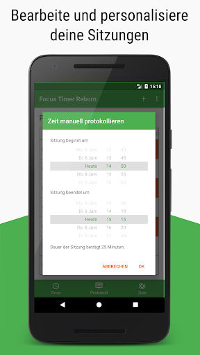 - Erlaubt es dir drei verschiedene Einheiten der Arbeit aufzuzeichnen (Fokussierte Arbeitssitzung, kurze Pause, lange Pause)