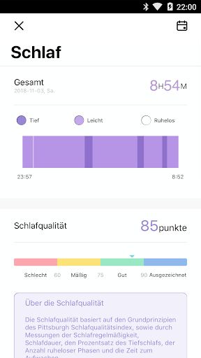• Schlaf: Erfahre mehr über deinen Schlaf mit der integrierten Schlafanalyse. Die App zeigt dir die Dauer der Leichtschlaf-, Tiefschlaf• und Ruhelos-Phasen an. ¹