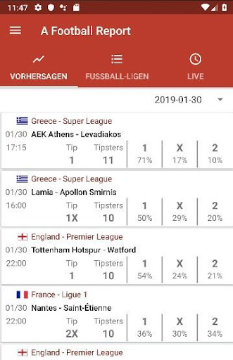 Täglich aktualisierte Fußballtipps und erweiterte Statistiken für Fußballspiele, Ligen und Pokale. In-Play-Vorhersagen und Live-Spielanalyse. 1X2 Tipps. Unter Über Tore. Erste Halbzeit Tore. Beide Teams Treffen. Ecken. Handicaps. Gewinne/Verluste/Unentschieden