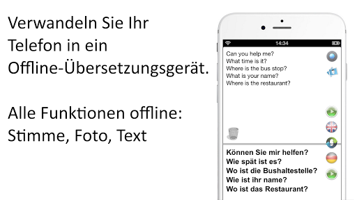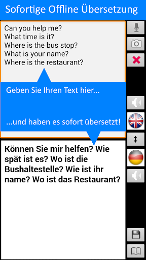 Diese Applikation übersetzt Texte, Sprach und Foto von und nach Englisch und Deutsch ohne Internet/3G/wi-fi.