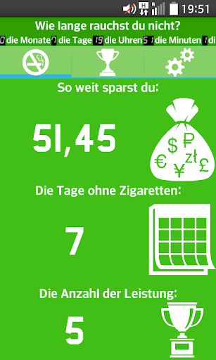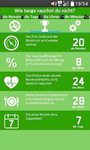 Die App "Entsag dem Rauchen!" zeigt dem Anwender die Vorteile auf, mit dem Rauchen aufzuhören. Die Anwendung ermöglicht es dem Benutzer, seine individuellen Daten einzugeben und zu beobachten, welche Veränderungen sich durch den Verzicht auf Zigaretten einstellen und welche Vorteile dadurch entstehen. Das Programm berechnet zum Beispiel die prozentual gewonnene Lebenszeit, das ab dem Zeitpunkt des Aufhörens gesparte Geld, sowie die positiven Auswirkungen auf den Organismus des Anwenders. Alle diese Informationen sollen den Benutzer motivieren, bei diesem gesunden Lebensstil zu bleiben. Doch bedenken Sie, dass der individuelle Erfolg von der Willenskraft des Einzelnen abhängt.