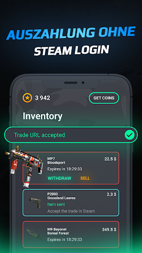 Laden Sie die Caseopener-App für CS: GO-Cases herunter, verdienen Sie Münzen, öffnen Sie CS: GO-Cases mit Auszahlung über einen Handelslink und erhalten Sie kostenlos CS: GO-Cases - nur für Ihren Verstand und Ihre Zeit. Zeigen Sie Ihren Freunden den neuen Skin, den Sie aus der GOCASES erhalten haben, und laden Sie sie über Ihren Empfehlungslink ein und Ihr Freund erhält 20 Münzen. Viel Spaß! :)