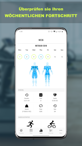 - Überprüfen Sie Ihre Statistiken und sehen Sie wie Ihr Workout Ihre Muskelgruppen beeinflusst