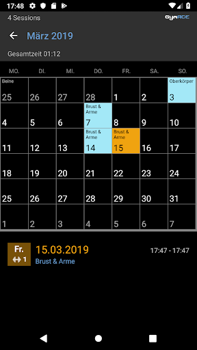 • Du betrachtest deine Ergebnisse in einem präzisen und kompakten Format, gruppiert nach Datum und Übung. In der Kalenderansicht kannst du einen ganzen Trainingsmonat auf einen Blick sehen.