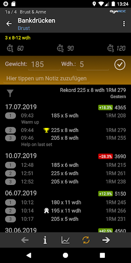 • Zeigt dir frühere Trainingsergebnisse direkt auf dem Eingabebildschirm, sodass du dein Ziel kennst - kein Rumsuchen, kein Wechsel zwischen Registerkarten, sie sind einfach da.