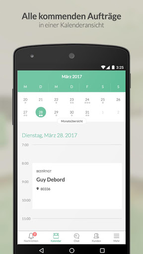 Sehen Sie alle angenommenen Aufträge und Auftragsangebote in einer praktischen Kalenderansicht. Auch die Kundenadresse wird angezeigt, damit Sie Ihre Termine besser aufeinander abstimmen können.