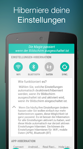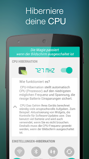 Android-Geräte sind so konzipiert die ganze Zeit arbeiten, sogar wenn du die nicht benutzst! Hibernation Manager hilft dir um Batterie zu sparen, wenn du das Gerät nicht verwendst. Wenn der Bildschirm ausgeschaltet ist, das Gerät hiberniere deine Prozessor (CPU), Einstellungen und sogar Applikationen um deine Batterie zu schonen.