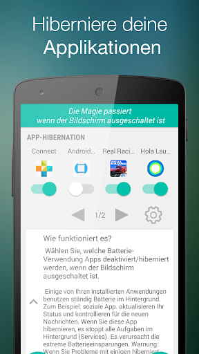 Wählen Sie, welche Batterie-Verwendung Apps deaktiviert/hiberniert werden, wenn der Bildschirm ausgeschaltet ist. Einige von Ihren installierten Anwendungen benutzen ständig Batterie im Hintergrund. Zum Beispiel: soziale App. aktualisieren Ihr Status und kontrollieren für die neuen Nachrichten.