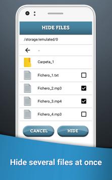 It is very easy to use; the application shows a browser to select the files you want to hide. You can select several files at the same time to hide them. The first time a file is hidden the users have to protect the app with a password. You can view and restore the hidden files in "My Hidden files" option.