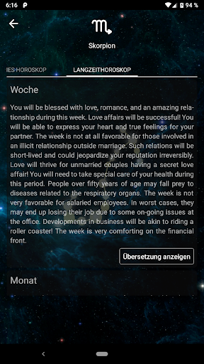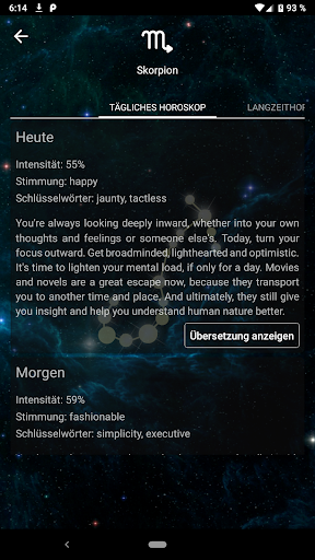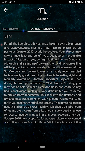 Ihr Horoskop ist der Spiegel der Vergangenheit, Gegenwart und Zukunft Ihres Lebens. Es hilft, Herausforderungen zu entschlüsseln, Gelegenheiten zu erschließen und Rätsel zu lösen, die Ihnen den Weg zu Erfolg und Frieden versperren. Schauen Sie mit unserer App in die Zukunft! Die Anwendung «Horoscope Pro» zeigt die astrologische Vorhersage eines professionellen Astrologen für gestern, heute, morgen, Woche, Monat und 2019 das ganze Jahr. Das Tageshoroskop wird täglich aktualisiert. Kennen Sie Ihr Horoskop, um die für Sie bevorstehenden kosmischen Ausrichtungen zu erkennen.