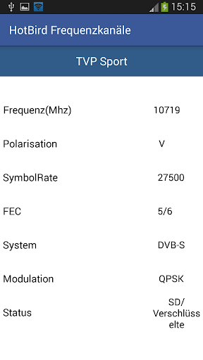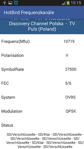 • Detaillierte Informationen für jeden Kanal (Frequenz - Polarisation - SR -FEC -Modulation -System -. Channel Status (SD oder HD / verschlüsselt oder Löschen))