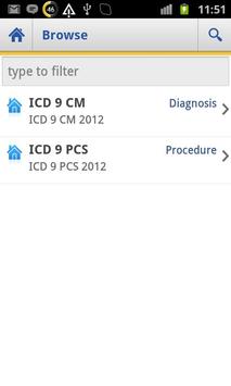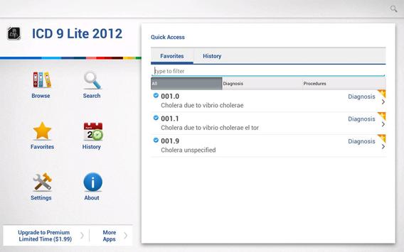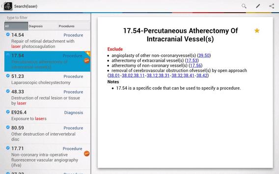 Search by code or diagnosis, through the whole ICD9-CM or through just a category or selected nonspecific code. Images within the list indicate whether a code is specific or nonspecific. Tap to view the diagnosis and the full text of its standard ICD-9 long description and to add it to your Favorites list for immediate access later.