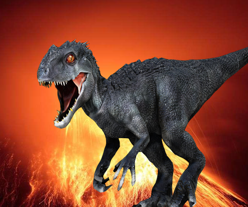 Indo Raptor Jurassic Hybrids Photo Editor App. Make Jurassic Photos with Hybrid Dinosaur Sticker like T-Rex or Indo Raptor. Run away on a Picture and modify with Meat-Eating Dinos chasing you.