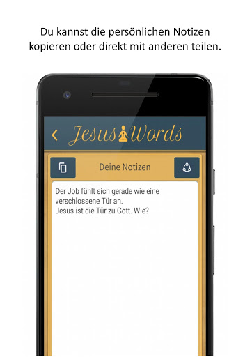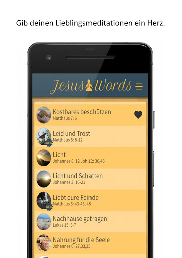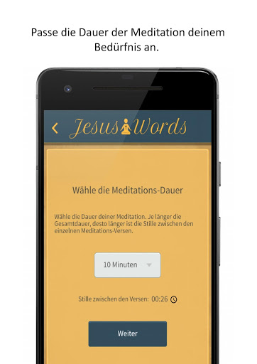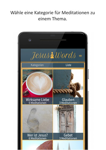 Die Jesus Words Meditation App enthält geführte Audio-Meditationen. Jede Meditation besteht aus drei Teilen. Über den Atem und das Körperbewusstsein wirst du in die Stille geführt. Du sollst ganz im Moment ankommen können und Ruhe finden. Das bereitet dich vor, den Worten von Jesus zuzuhören, die im Hauptteil gelesen werden. Die Stille zwischen den Versen erlaubt es, tief über die Worte nachzudenken und sie zu dir sprechen zu lassen. Der dritte Teil der Meditation gibt dir Zeit, über das Erlebte nachzudenken und es festzuhalten. Die Meditation kann alleine oder als Gruppe erlebt werden.