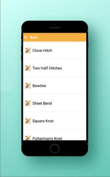 Knots are categorized by type and each knot has a description and step by step instructions with pictures and guide on how to tie it.