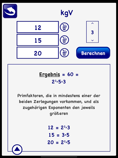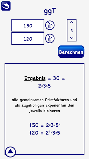 Diese Anwendung ist ein mathematisches Werkzeug, mit dem Sie der ggT (größte gemeinsame Teiler) und das kgV (kleinste gemeinsame Vielfache) von bis zu 4 Zahlen ermitteln können.