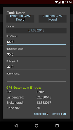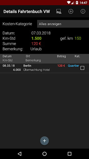 Zusätzlich ist ein Fahrtenbuch integriert. Hier können Informationen zu Dienstreisen oder Urlaubsfahrten erfasst werden, so z.B. auch die GPS-Koordinaten einer Übernachtung.