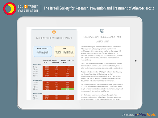Die israelische Gesellschaft für Forschung, Prävention und Behandlung von Atherosklerose gibt israelische und weltweite Gesundheitsdienstleister eine praktische App für kardiovaskuläre Risikobewertung und -management. Die App basiert auf der europäischen systemischen Koronarrisikoschätzung (Score) und der Aktualisierung der israelischen Richtlinien für die Behandlung von Hyperlipidämie 2014.