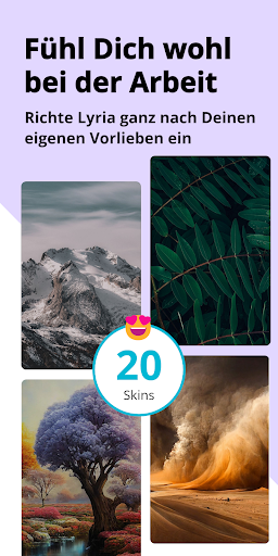 Damit die Arbeit noch mehr Spaß macht und Du Dich wohl fühlst, bietet Dir Lyria 20 atemberaubende Skins, mit denen Du Deine Arbeitsumgebung ganz nach Deinen Wünschen gestalten kannst! Egal, ob Du es bunt und fröhlich oder eher schlicht und minimalistisch magst - mit unseren Skins hast Du die volle Freiheit, Dein persönliches Arbeitsumfeld zu gestalten. Du kannst jederzeit zwischen den verschiedenen Designs wechseln und Deine Umgebung an Deine Stimmung anpassen.