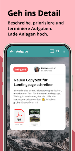 Lyria macht es extrem einfach, gemeinsam an Aufgaben zu arbeiten! Du kannst ganz leicht Mitarbeiter hinzufügen und Aufgaben an Dein Team verteilen. Aber das ist noch nicht alles - natürlich könnt Ihr auch Dateien teilen und zusammen über Aufgabeninhalte und Fortschritte chatten.