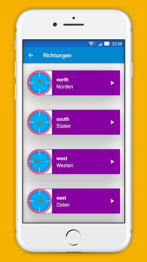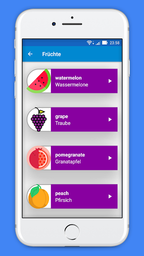 Nummern, Familie, Farben, Sätze, Wetter, Früchte, Einkaufen, Zeit, Kalender, Berufe, Körpere, Gesundheit, Notfall, Richtung, Essen, etc ....