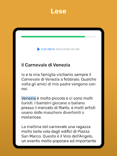 Ein für dich entwickelter Lernprozess, der einfach ist und dich führt: Du wirst merken, dass du jeden Tag mehr und mehr Italienisch lernst. Jeder Satz, jede Übung, jede Überprüfung und jede Leseübung wurden sorgfältig für dich ausgewählt.