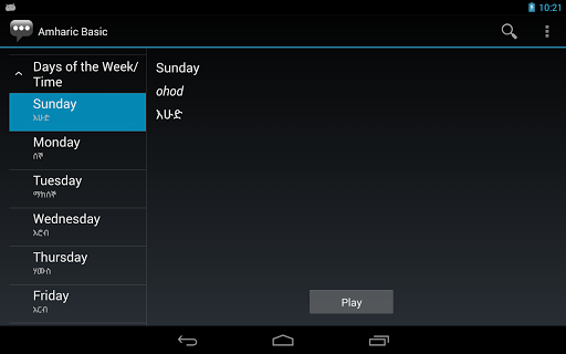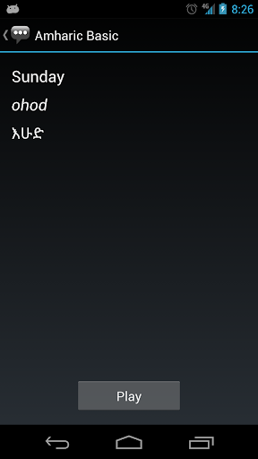 3. Auf der Phrase -Detail -Seite wird die Amharische Phrase neben seiner Aussprache und der äquivalenten englischen Phrase gezeigt. Drücken Sie die Wiedergabetaste, um die Audioaussprache durch einen Muttersprachler zu hören. Profis