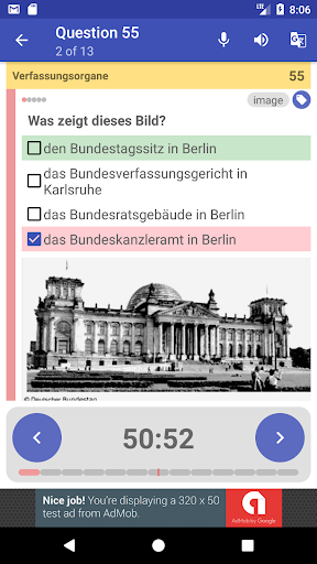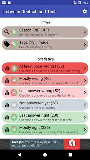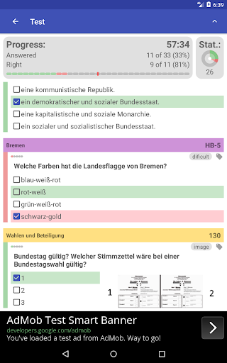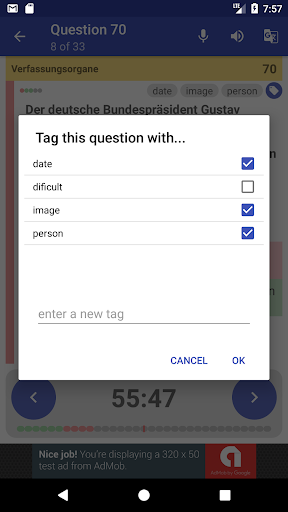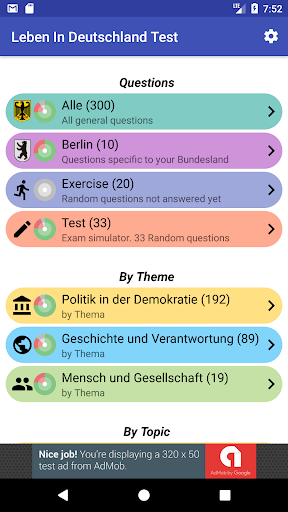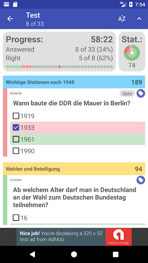 Mit dieser App können Sie Ihre Studie für den Test organisieren. Es ist nach Themen und Interessengebieten gegliedert. Sie können Ihr Bundesland auswählen, einige Fragen mit Ihren benutzerdefinierten Tags wie "schwierig" kennzeichnen oder einfach nach einem bestimmten Wort wie "DDR" suchen. Die App kann Ihnen die Frage sogar vorlesen. Sie können jede Frage auch in Ihre Muttersprache übersetzen.