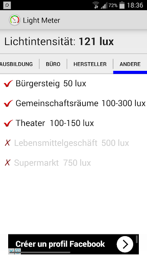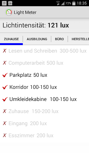 Light Meter ist eine App, die Lichtintensität Bereich für unterschiedliche Aktivitäten / Umgebungen empfohlen bietet und prüfen, ob die aktuelle Licht für welche Tätigkeiten / Umgebungen geeignet ist. Sie trägt Ihre Sehkraft zu schützen!