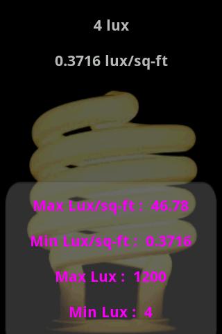 Measure the light near you. This is 15 days trial. DONT purchase the full version if this does not work at your end. Requires light sensor. The app gives you current measure of how intense the light focused on your phone is. It also gives maximum amp; minimum value of luminosity. Intensity of light is measured in terms of luxsq feet.note THE APP REQUIRES YOUR PHONE TO BE EQUIPPED WITH LIGHT SENSOR.