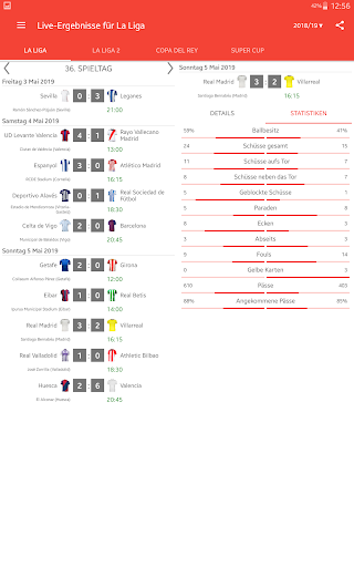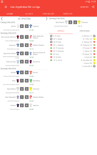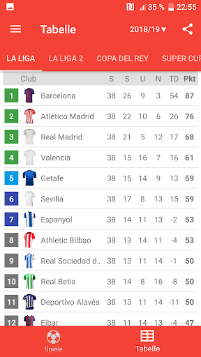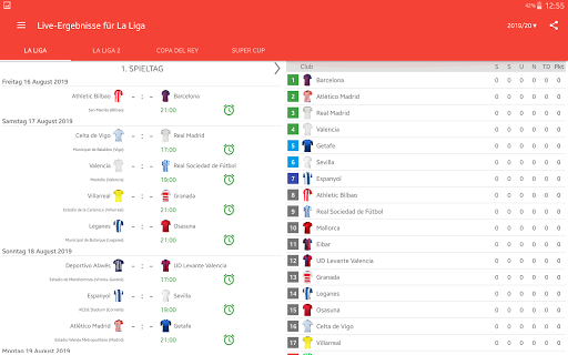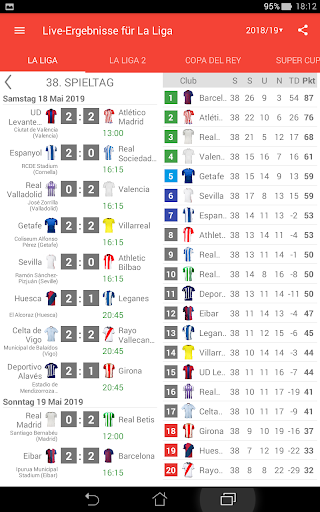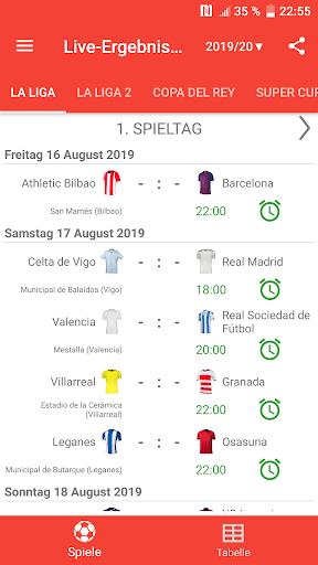 Live-Ergebnisse für La Liga 2023/2024 ist die App, die Ihnen erlauben, die Spiele der Fußballmeisterschaft in Spanien online zu folgen, wenn Sie keine Möglichkeit haben TV oder Live Stream zu sehen. Es enthält einen Kalender, Spielplan, Tabellen und Ergebnisse der LaLiga EA Sports, LaLiga Hypermotion, Copa del Rey und Super Cup. Die App ist ein Programm, das Ihnen nicht ein Tor oder Beginn eines Spiels verpassen darf und Ihnen eine Push-Benachrichtigungen sendet. Sie können Lieblings Matches wählen und Benachrichtigungen für sie erhalten. In LaLiga-Saison 2023/24 spielen die Mannschaften: FC Barcelona, Real Madrid, FC Sevilla, UD Almería, FC Cádiz, FC Granada, UD Las Palmas, Rayo Vallecano, Real Sociedad, RCD Mallorca, FC Girona, Atlético de Madrid, Villarreal CF, Deportivo Alavés, CA Osasuna, Getafe CF, Real Betis, RC Celta, Valencia CF und Athletic Club.