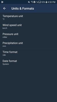 - Change unit setting: Temperature (C/F), Time format (12h/24h), Precipitation (mm, inch), wind speed (km/h, mi/h, m/s), pressure (mmhg, hPa, mbar)