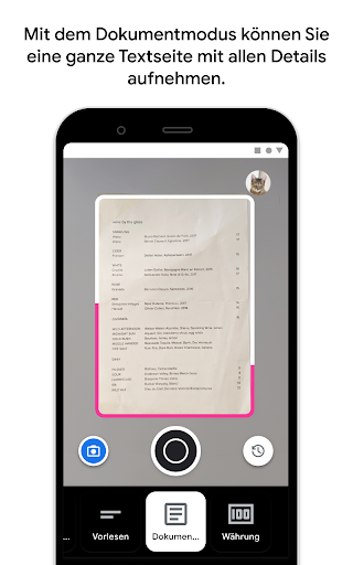 • Mit dem Dokumentmodus können Sie sich eine ganze Textseite vorlesen lassen. Machen Sie dazu ein Foto des Dokuments. Lookout scannt dann den Text, damit er vom Screenreader vorgelesen oder auf Ihrem Smartphone vergrößert dargestellt werden kann.