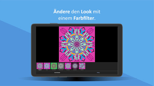 Gestalte deine Werke einfarbig oder bunt - ganz wie es dir am besten gefällt. Eine Farbe ist schnell gewählt. Durch Aktivieren der Spiegel-Option oder das Verändern der Facettenanzahl entstehen immer wieder neue Muster.