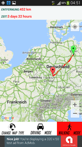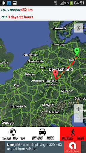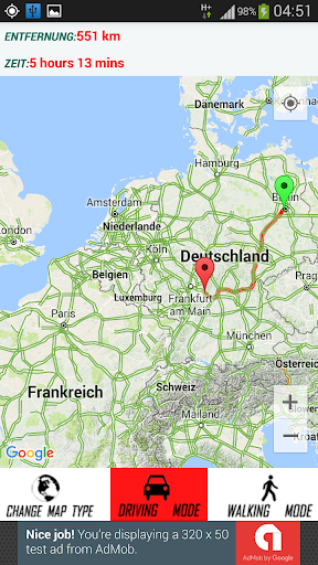 3. Klicken Sie auf Entfernungsrechner, dann wählen Sie zuerst zwei beliebige Orte aus und wählen Sie den Modus (Fahren oder Gehen), die Route wird angezeigt, Distanz und Zeit werden ebenfalls angezeigt, mit der Möglichkeit, die MAP-Typen & zurück zur aktuellen Position zu ändern