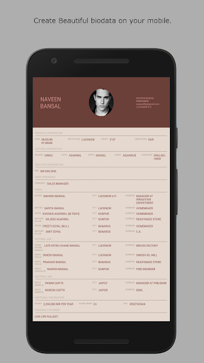 Biodata Maker provides easy and clean interface to enter your details and guides you step by step to create a attractive biodata for you and for your loved ones.