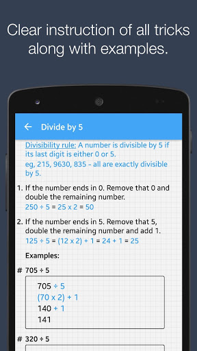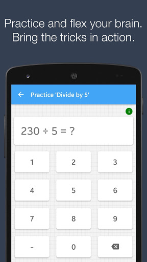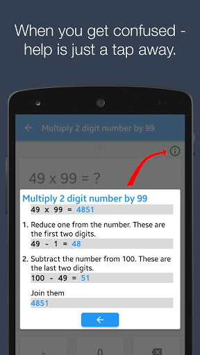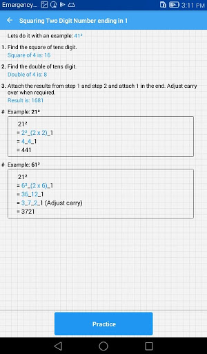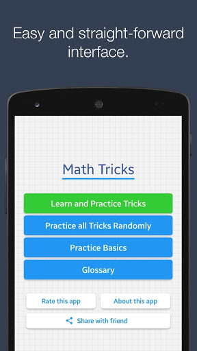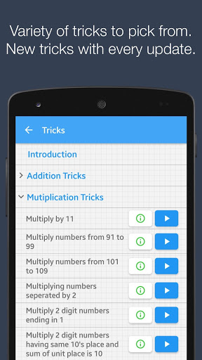 This app comes packed with different easy math tricks to help you solve harder challenges. These tricks are well organised under "Learn and Practice Tricks" section. If you are a beginner you are recommended to take few practice tests from "Practice Basics" section. Once you are confident enough you can take the further test from this sections in parallel with "Learn and Practice Tricks".