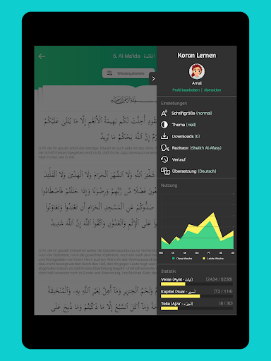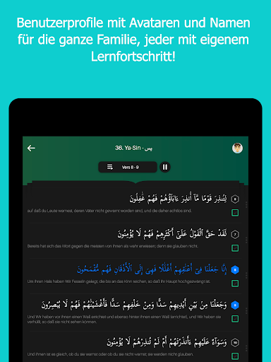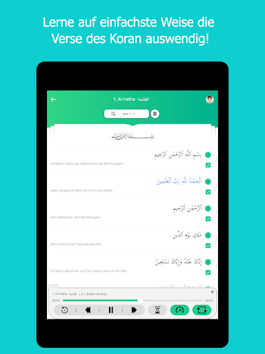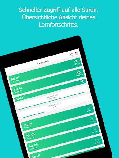 - Der gesamte Koran mit übersichtlicher Fortschrittsanzeige der gelernten Suren und Verse