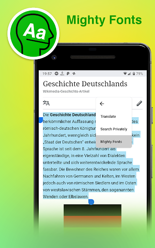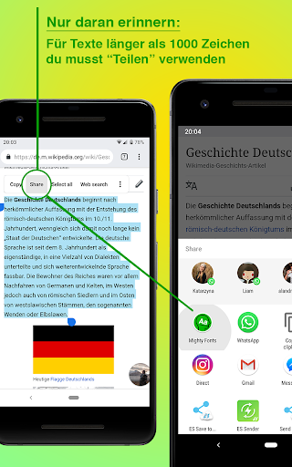 Diesel App nutzt 2 Schriftarten, Sans Forgetica und Open Dyslexic, das Lesen und Studieren zu erleichtern. Einfach wähl ein beliebiger Text aus und klick auf "Mighty Fonts"im Kontextmenü. Mehr als 1000 Zeichen? Wähl “Teilen” aus im Kontextmenü und dann klick auf "Mighty Fonts". Du kannst Inhalte auch direkt aus der Zwischenablage in die App einfügen.